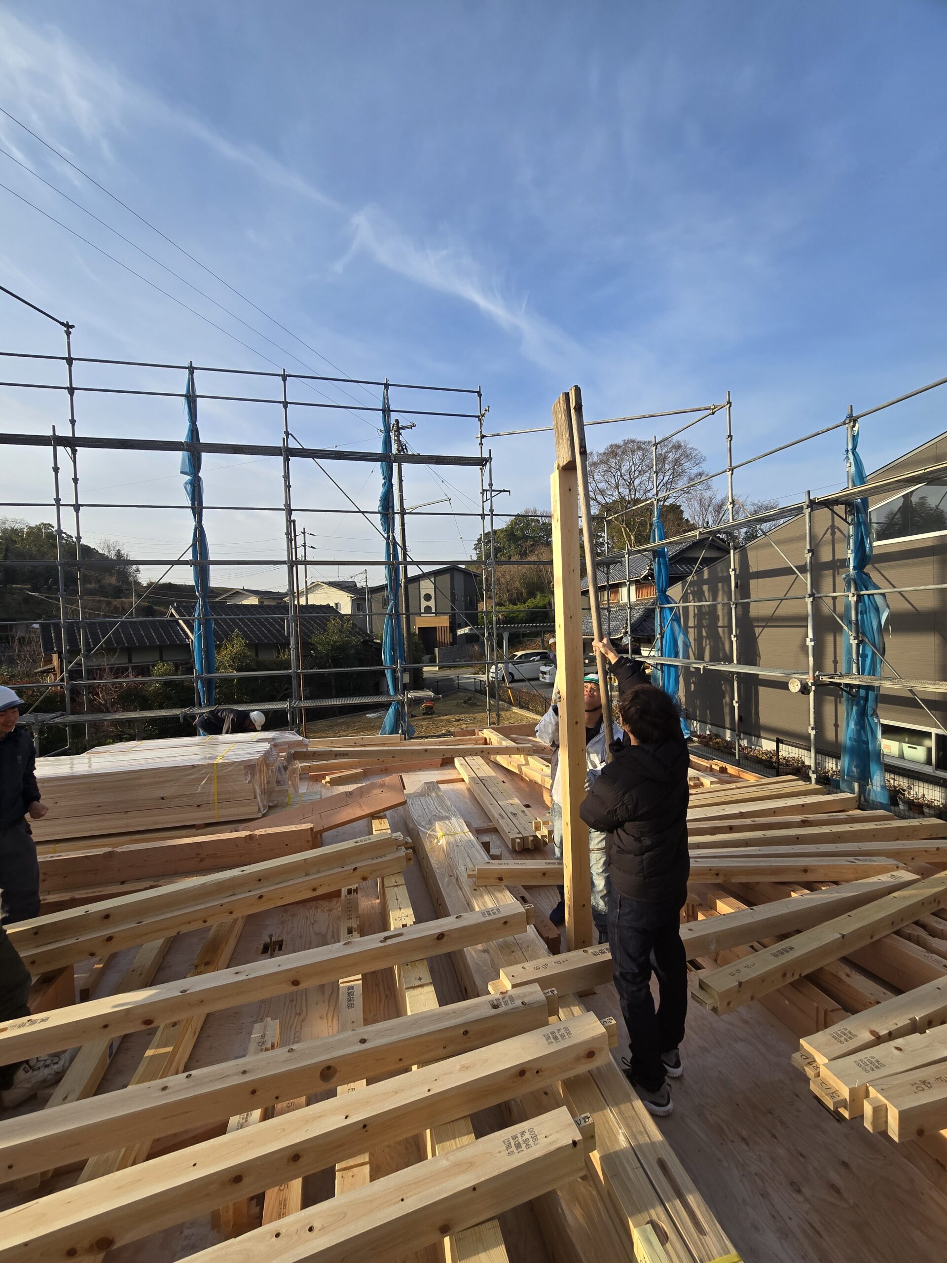 例年より遅めの『お椿さん』が23・24・25と開催されている丁度中日。 2月だし、しかもお椿さんの最中、特に寒いのではないかと危惧していたのですが、比較的暖かく動きやすい上棟日でした。 1週間前は朝から雨予報でしたが当日は夕方からに変わっていました。 予報通り建前が終わるころ降り出しました。 やっぱり!〝守られている〟 勝手に解釈するのです。 素敵な上棟式が出来たことに感謝です。ありがとうございました。