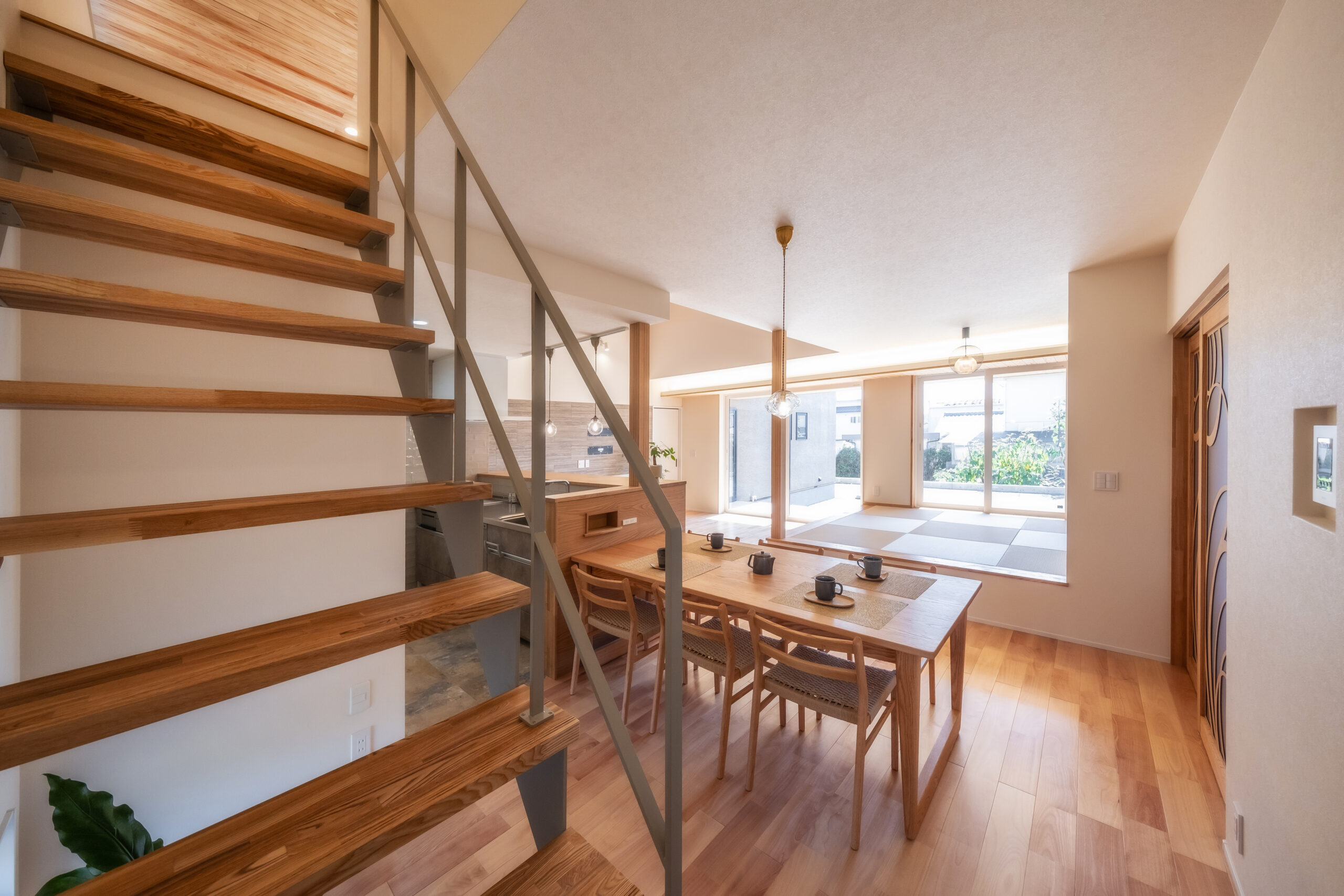 "家のどこにいても存在感を感じられる、つながりを大切にした間取り。 お施主様が最もこだわったのは、少し贅沢でホテルライクなトイレ。照明や素材にもこだわり、落ち着きのあるシックな雰囲気に仕上げました。 奥様のご希望で採用した並列型のダイニングキッチンが映えるLDKでは、ソファを置かず、畳コーナーでくつろぐご家族の姿が目に浮かびます。"